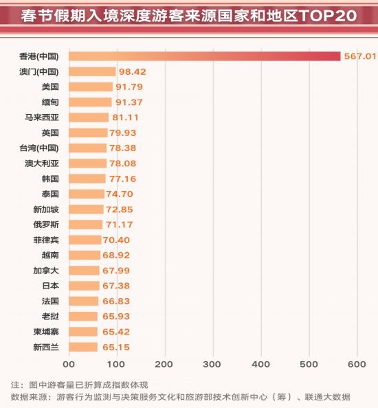 春節(jié)假期期間, 136.6萬人的入境深度游客(來自境外,并在大陸城市停留6小時(shí)以上的游客人數(shù),以下簡(jiǎn)稱“深度游”)的大數(shù)據(jù)樣本顯示,入境游客量前20的城市共接待入境深度游客87.0萬人。
