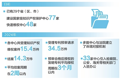 保護(hù)知識產(chǎn)權(quán)就是保護(hù)創(chuàng)新。中共中央、國務(wù)院印發(fā)的《知識產(chǎn)權(quán)強國建設(shè)綱要(2021—2035年)》提出,“建立完善知識產(chǎn)權(quán)仲裁、調(diào)解、公證、鑒定和維權(quán)援助體系”。目前,已有29個?。▍^(qū)、市)建設(shè)國家級知識產(chǎn)權(quán)保護(hù)中心77家、快速維權(quán)中心48家。