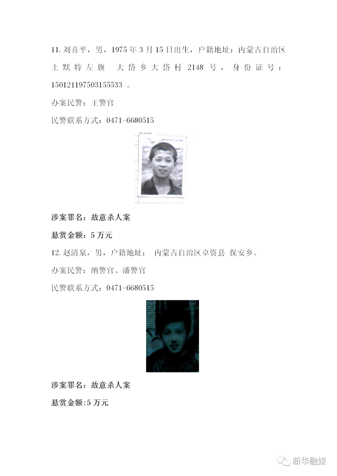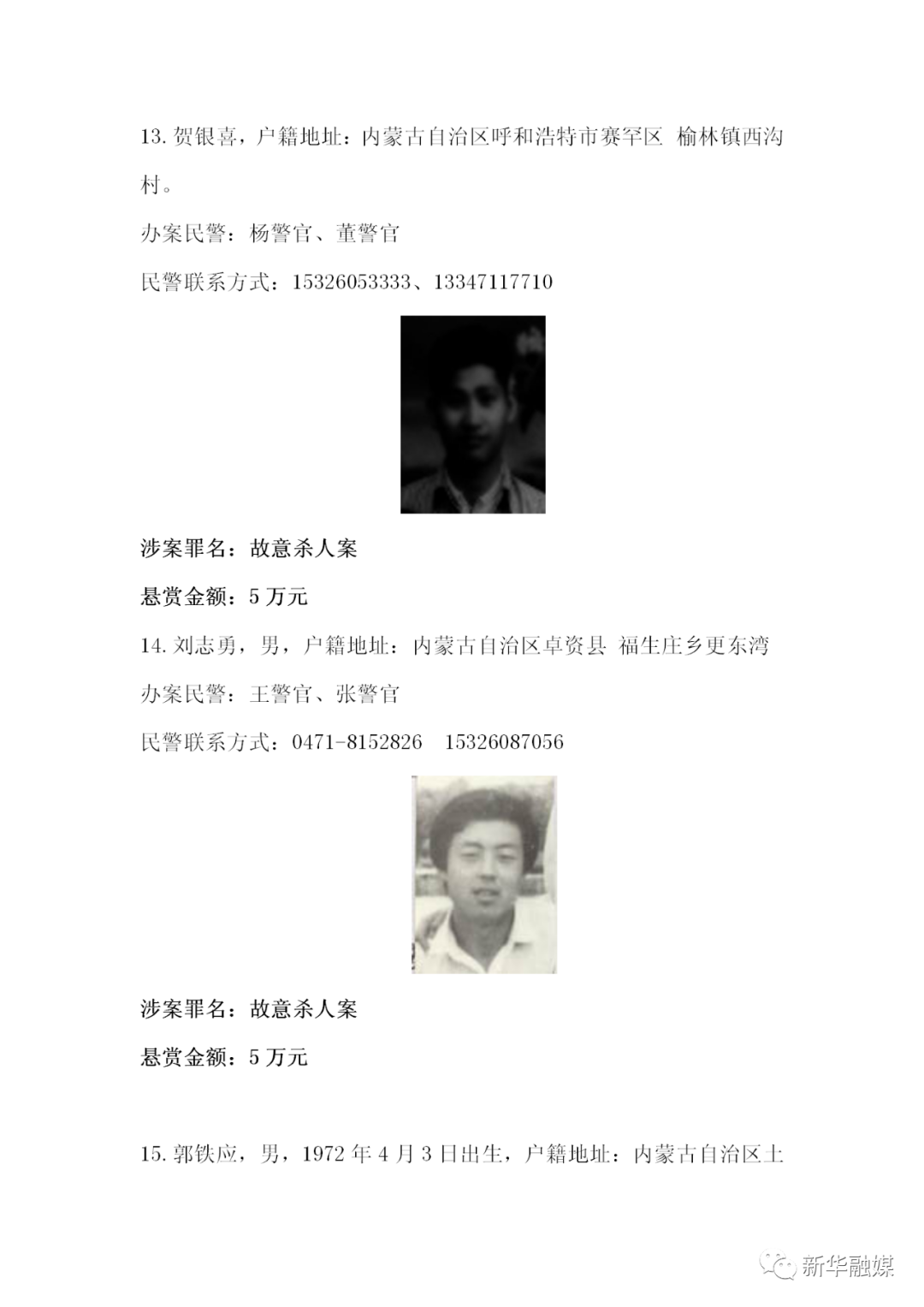 如發(fā)現(xiàn)在逃人員及有關(guān)情況,及時(shí)撥打呼和浩特市公安局“追逃辦”民警電話或110報(bào)警電話。對提供有效線索的單位或個(gè)人,公安機(jī)關(guān)將給予5萬元人民幣獎(jiǎng)勵(lì)。