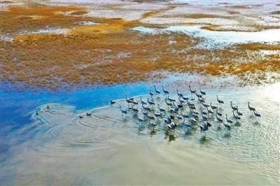 3月的鄂托克草原春光明媚、萬物復蘇。黃河一級支流——都思圖河兩岸,風吹草偃間,珍禽掠影過,灰鶴、赤麻鴨、天鵝、豆雁等各種鳥類在河中嬉戲打鬧,一幅人與自然和諧共生的美麗生態(tài)畫卷徐徐呈現(xiàn)。