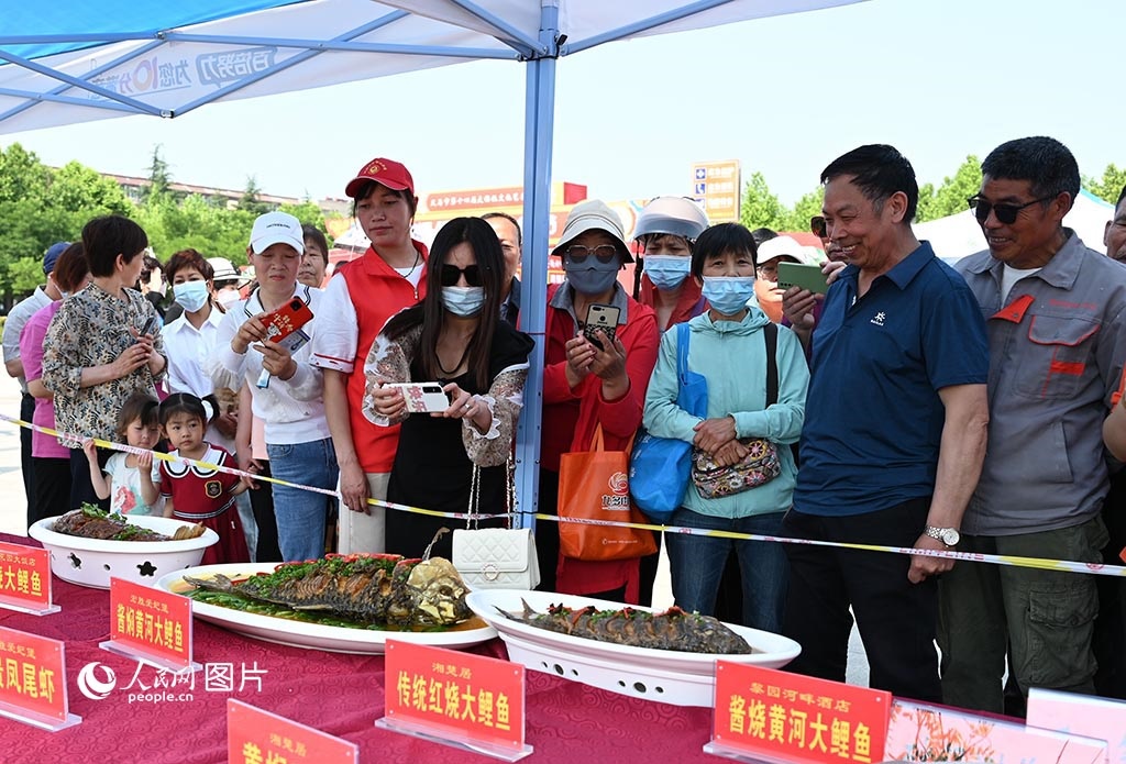 5月17日,“中國旅游日”主題周活動期間,河南省義馬市舉辦“櫻紅五月”美食節(jié),集中展示當(dāng)?shù)氐奶厣朗?、名?yōu)特產(chǎn),為了讓游客有更好的體驗,當(dāng)?shù)?2家飯店還進(jìn)行了精彩紛呈的廚藝大比拼?;顒蝇F(xiàn)場,游客在圍觀經(jīng)典豫菜“紅燒黃河大鯉魚”。人民網(wǎng)記者 王玉興攝