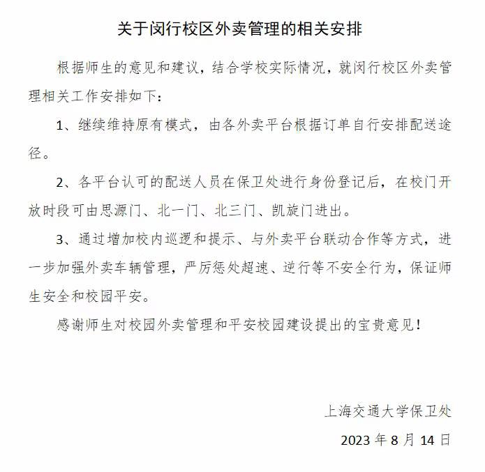 通知顯示,即日(8月3日)起,原外賣平臺向保衛(wèi)處備案過的外賣配送員,可從東川路600號(“凱旋門”)入校完成配送,未經(jīng)平臺報(bào)備的外賣配送員禁止進(jìn)校配送,只需將交大外賣訂單送至就近中轉(zhuǎn)站即可。9月1日起,所有外賣配送員禁止入校,校園外賣專送團(tuán)隊(duì)承接所有校園外賣訂單。