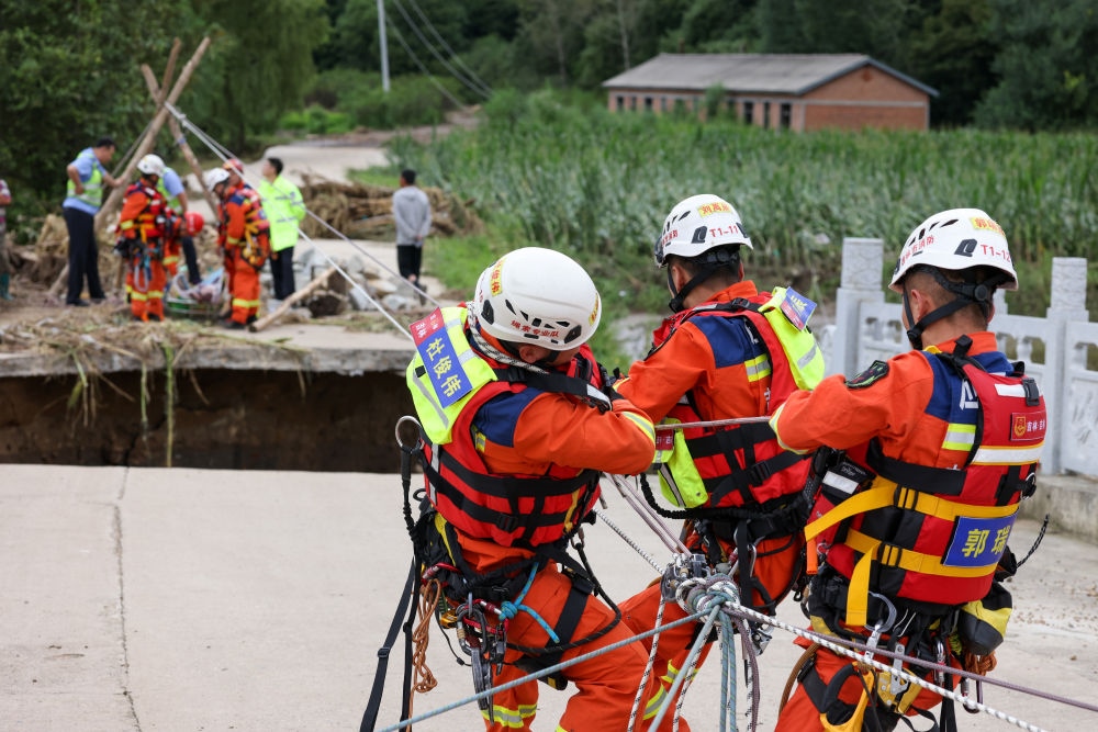 8月6日,吉林市消防救援支隊(duì)隊(duì)員利用繩橋解救受困村民。新華社記者 顏麟蘊(yùn) 攝