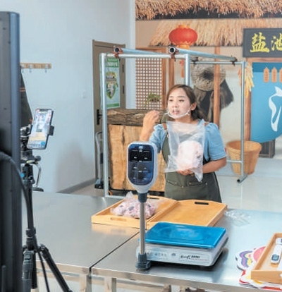 鹽池縣一家電商企業(yè)主播推介銷(xiāo)售灘羊肉。鹽池縣委宣傳部提供