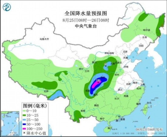 8月25日08時至26日08時,內(nèi)蒙古河套地區(qū)、黑龍江東部、吉林東部、甘肅東部、寧夏、四川中東部、重慶、河南西部、湖北西部、貴州北部、云南南部、廣東南部以及西藏東部、青海南部等地的部分地區(qū)有中到大雨,其中,陜西南部、四川東北部、重慶西部和北部等地的部分地區(qū)有暴雨或大暴雨(100~180毫米)。遼東半島、山東半島等地的部分地區(qū)有4~5級風(fēng)。