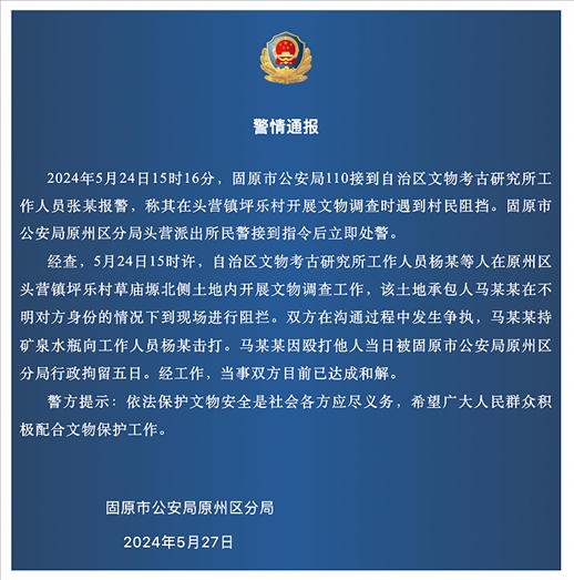 經(jīng)查,5月24日15時許,自治區(qū)文物考古研究所工作人員楊某等人在原州區(qū)頭營鎮(zhèn)坪樂村草廟塬北側(cè)土地內(nèi)開展文物調(diào)查工作,該土地承包人馬某某在不明對方身份的情況下到現(xiàn)場進行阻攔。雙方在溝通過程中發(fā)生爭執(zhí),馬某某持礦泉水瓶向工作人員楊某擊打。馬某某因毆打他人當日被固原市公安局原州區(qū)分局行政拘留五日。經(jīng)工作,當事雙方目前已達成和解。