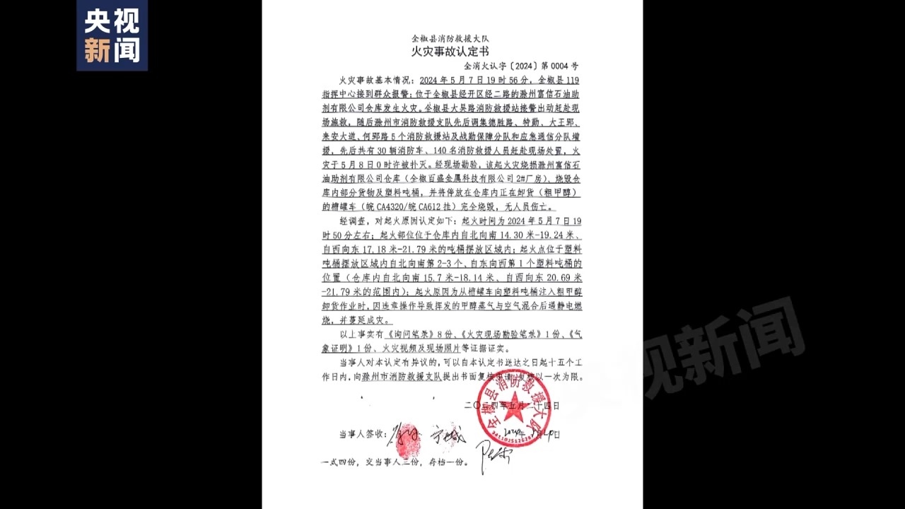 記者從全椒縣消防救援大隊于5月24日出具的火災(zāi)事故認(rèn)定書上發(fā)現(xiàn),5月7日晚上7點(diǎn)多,滁州富信助劑有限公司倉庫發(fā)生火災(zāi),滁州市消防救援支隊調(diào)集30輛消防車、140名消防救援人員現(xiàn)場處置,火災(zāi)于5月8日0時許撲滅。經(jīng)現(xiàn)場勘驗(yàn),該起火災(zāi)燒損滁州富信石油助劑有限公司倉庫、燒毀倉庫內(nèi)部分貨物及塑料噸桶,并將停放在倉庫內(nèi)正在卸粗甲醇的槽罐車完全燒毀,無人員傷亡。