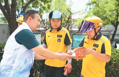 6月11日,北京市海淀區(qū)北太平莊街道總工會(huì)工作人員(左)為外賣配送員送上飲料及扇子。當(dāng)日,北京迎來高溫天氣,許多戶外勞動(dòng)者堅(jiān)守崗位,保障公共服務(wù)運(yùn)行。 新華社記者 任 超攝