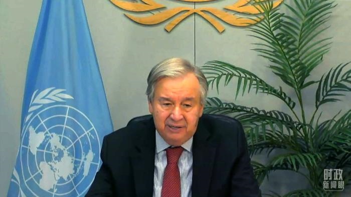 聯(lián)合國(guó)秘書(shū)長(zhǎng)古特雷斯通過(guò)視頻方式發(fā)表致辭。