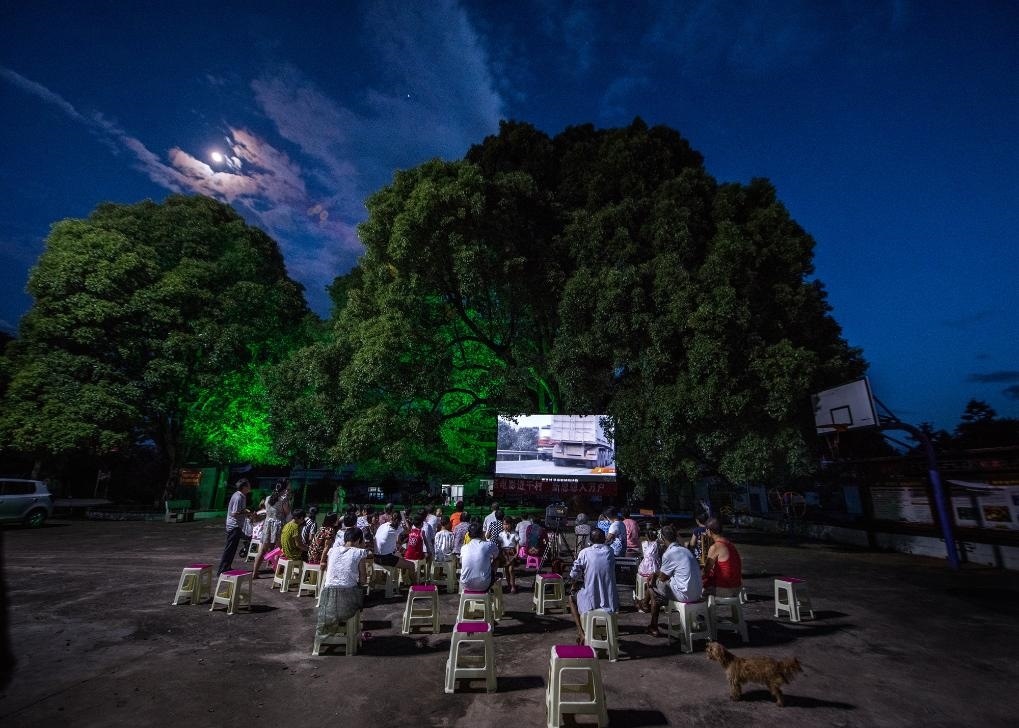 村民在菜花坪鎮(zhèn)菜塘村弄堂文化廣場(chǎng)觀看電影。(譚德樂(lè) 攝)