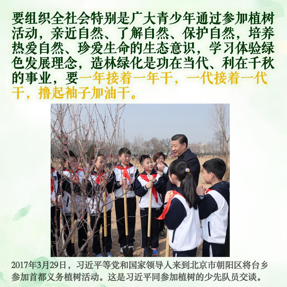 十年樹木,百年樹人。除去2020年因疫情防控考慮,每年植樹時,習總書記都要和少年兒童一起,培土澆水、談心交流。好好學習,鍛煉身體,熱愛勞動,愛護環(huán)境,德智體美勞全面發(fā)展,長大后成為建設祖國的棟梁之才……習爺爺的殷殷囑托和希冀,激勵著新時代少年兒童奮發(fā)有為、向陽成長。