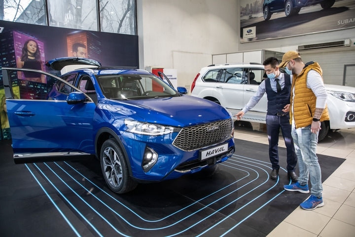 2021年4月1日,銷售人員在哈薩克斯坦阿拉木圖市經(jīng)銷商店向消費(fèi)者介紹哈弗汽車。新華社發(fā)(阿斯塔納汽車公司供圖)