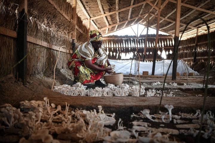 2024年2月6日,在中非共和國達(dá)馬拉,法蒂瑪在菇棚內(nèi)收獲菌草菇。2022年,法蒂瑪在聽說中國菌草專家在班吉傳授技術(shù)后主動前往學(xué)習(xí),從一間小菌棚起步,逐漸擴(kuò)大為如今小有名氣的合作社。新華社記者 韓旭 攝