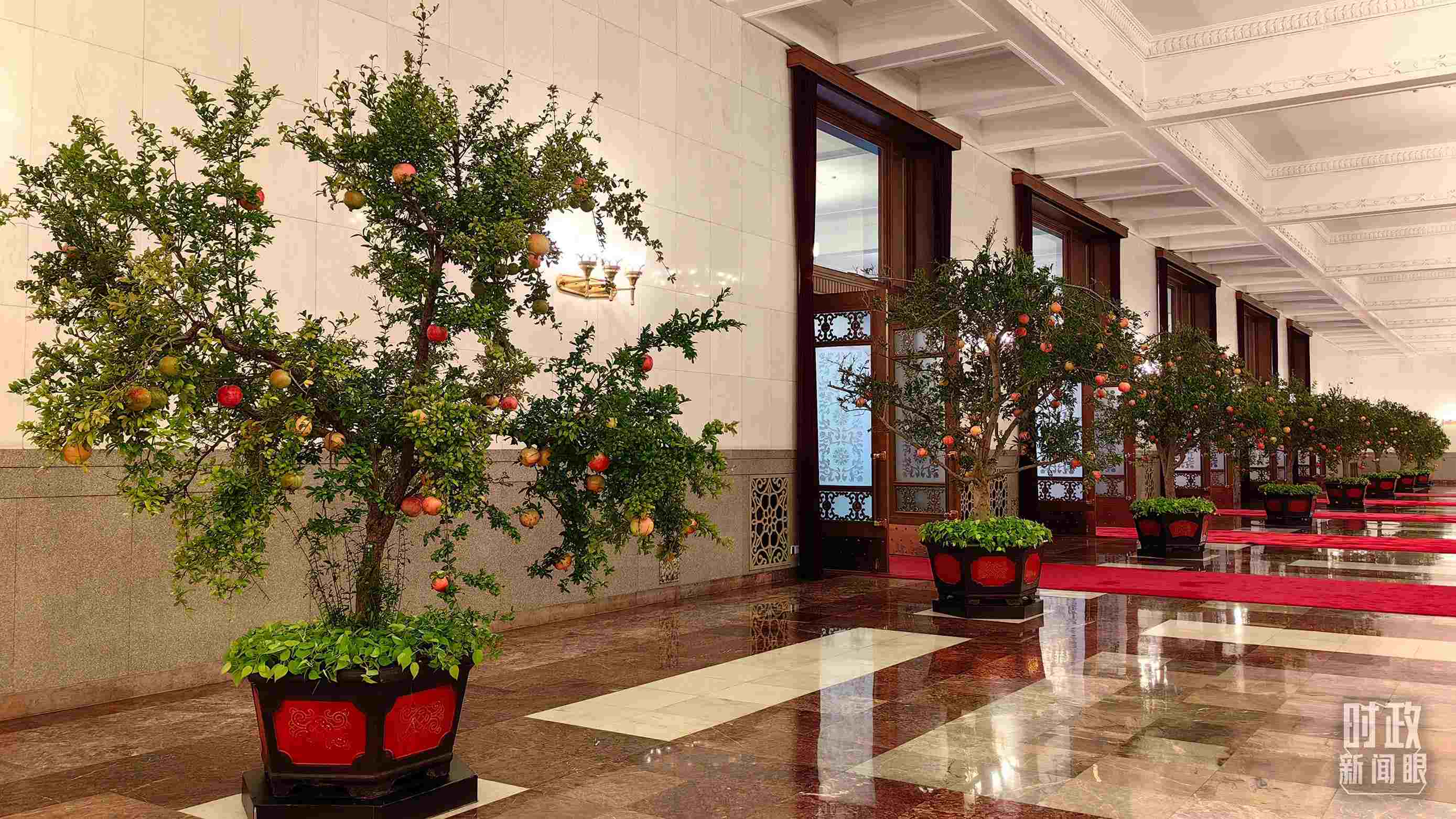 △人民大會(huì)堂碩果累累的石榴盆栽。(總臺(tái)央視記者王曉東拍攝)