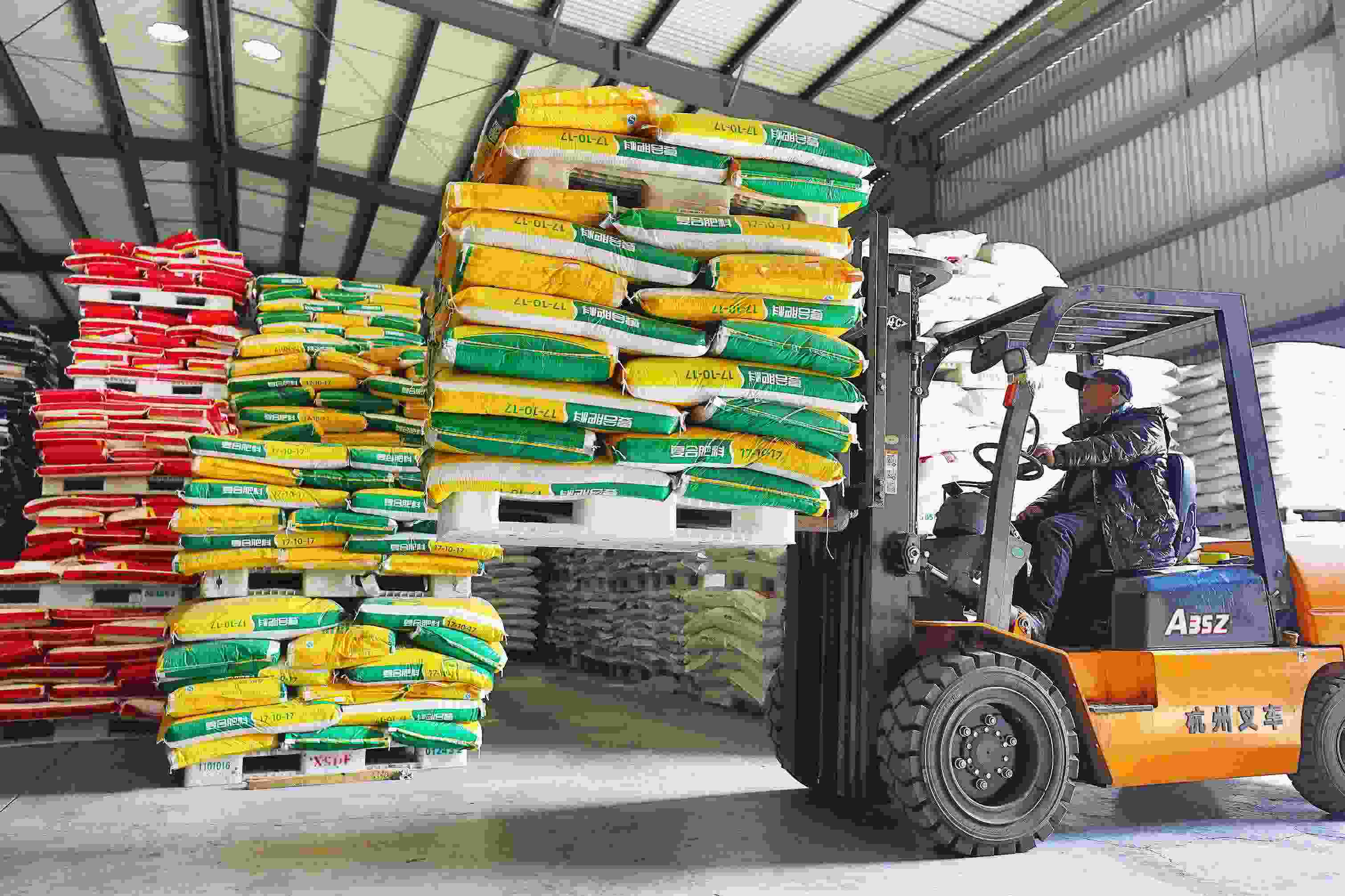2023年2月15日,在浙江義烏供銷聯(lián)社的農資貯存?zhèn)}庫,工作人員正在調運復合肥料等農資。