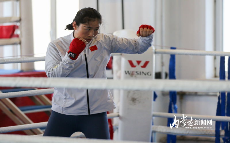 當(dāng)日,記者在拳擊館內(nèi)看到,在訓(xùn)練中李倩腳步輕盈,汗珠在額頭滑落。她戴上拳套,走向沙袋,一記記重拳砸出,發(fā)出沉悶的“砰”聲。內(nèi)蒙古女子拳擊隊的數(shù)十名拳手正在同時訓(xùn)練,沙袋晃動,呼吸急促,空氣中彌漫著汗水與堅持的味道?!胺朗?,腳下要穩(wěn)!”內(nèi)蒙古拳擊隊總教練哈達(dá)巴特爾的聲音在空間回蕩。李倩的訓(xùn)練格外嚴(yán)格。除了常規(guī)力量訓(xùn)練、反應(yīng)訓(xùn)練和體能循環(huán),她還要進(jìn)行一對一的與男拳手的實戰(zhàn)模擬,幾次交鋒下來,氣息都愈發(fā)急促。但李倩沒有退縮,反而越打越穩(wěn),腳步靈活,出拳干凈利落。