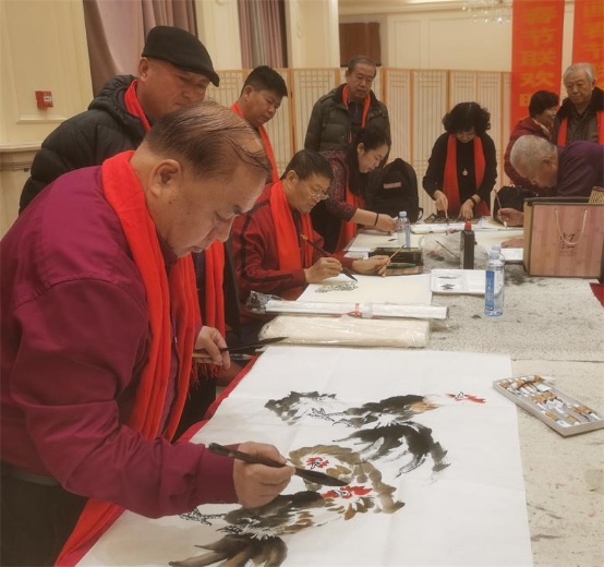 晚會伊始,為增添氣氛,書畫家們一邊拿出優(yōu)秀作品展覽,一邊傾情翰墨,盡展才藝,凝神筆端,徜徉藝海流連忘返。在書畫家們的筆下,一張潔白的宣紙上,揮毫出遒勁的丹青墨寶,一幅幅墨竹、牡丹、鳥語、花香,激發(fā)了現(xiàn)場文化底蘊與活力;書畫家們現(xiàn)場盡書情懷,一幅幅作品刻畫細致,生動傳神,揮毫抒情,內(nèi)涵豐富、風(fēng)格鮮明,既有雋秀端莊的篆書,又有古樸典雅的隸書;既有行如流水的行書,又有矯若驚龍的草書;既有悠遠細膩的工筆畫,又有意境深遠的山水寫意.......
