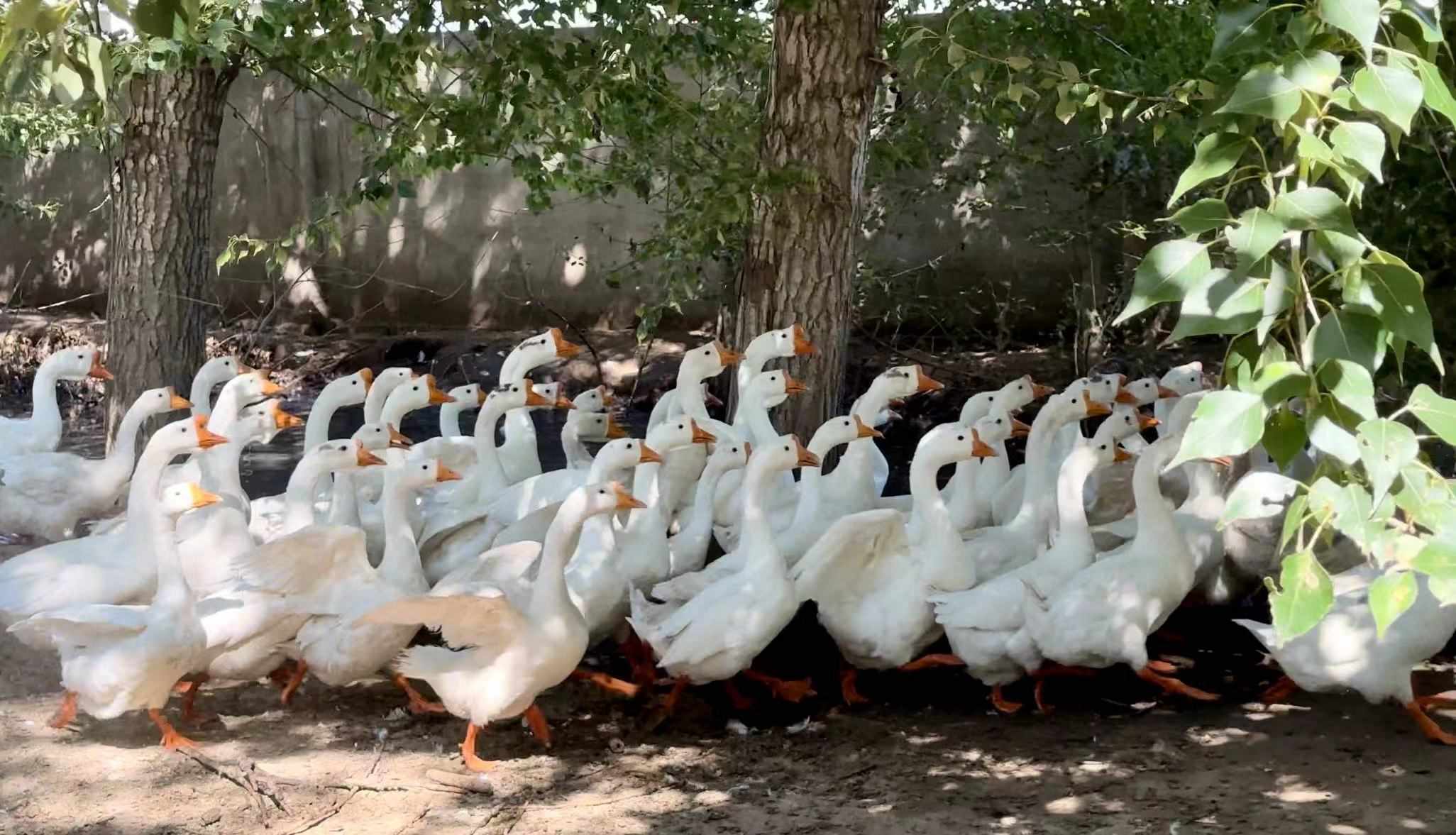 還在回味上一口醇香濃郁的沙棘汁,車輛就在不遠(yuǎn)處的慶和鎮(zhèn)南發(fā)村停下了車,一群群林下覓食的大鵝吸引著眾人目光。