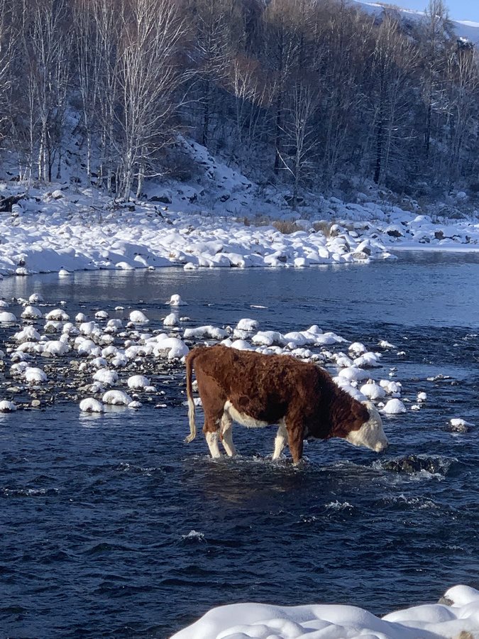遠山之上白雪皚皚,不凍河的熱氣蒸騰,潺潺流水順流而下,有牛在河邊喝水,黃湛琦將阿爾山冬天最美的景色定格在這一幕。
