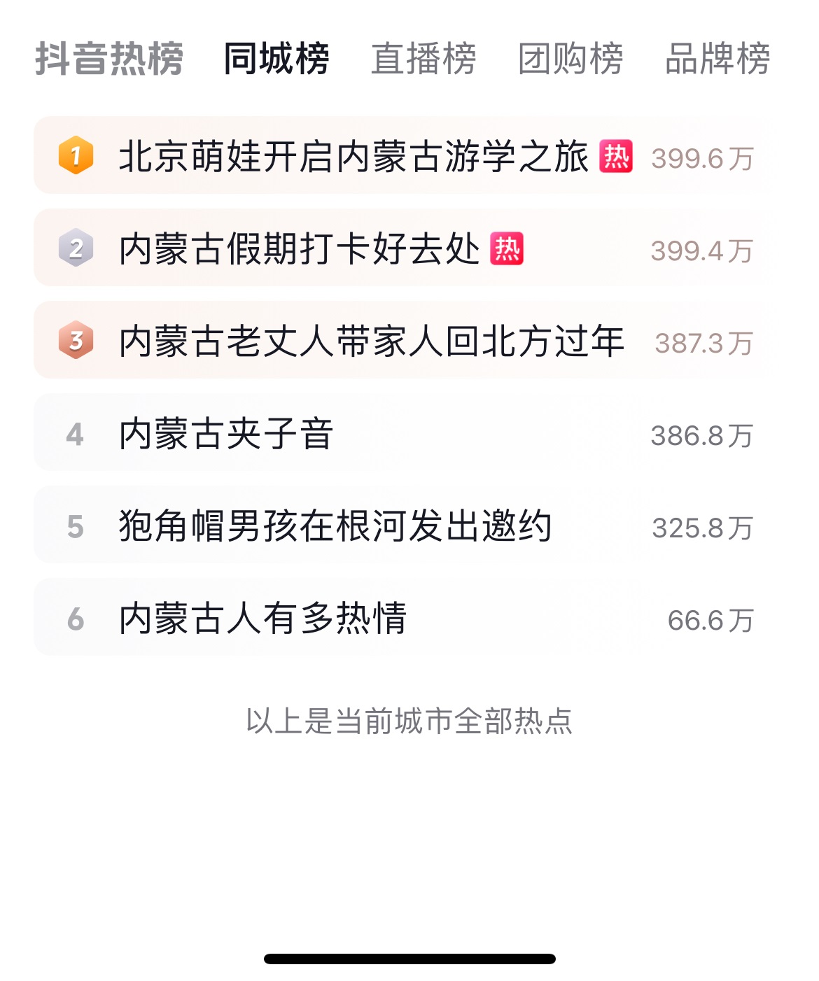 當(dāng)日上午9:57,G2459次動(dòng)車順利抵達(dá)呼和浩特火車東站,27名北京親子游學(xué)團(tuán)的萌娃們開(kāi)啟了一場(chǎng)歡快淋漓的冰雪體驗(yàn)游,他們的內(nèi)蒙古游學(xué)之旅并在當(dāng)日上了抖音同城榜第一名。