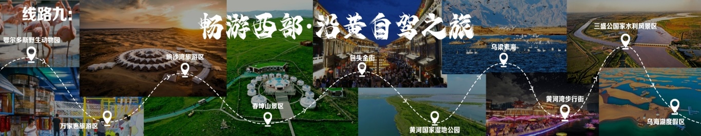 線(xiàn)路行程由鄂爾多斯出發(fā),至鄂爾多斯野生動(dòng)物園,至萬(wàn)家惠旅游區(qū),至響沙灣旅游區(qū)。到達(dá)包頭,至春坤山景區(qū),再至包頭金街,至黃河國(guó)家濕地公園。到達(dá)巴彥淖爾,至烏梁素海,再至黃河灣步行街,再至三盛公國(guó)家水利風(fēng)景區(qū),終點(diǎn)為烏海湖度假區(qū)。