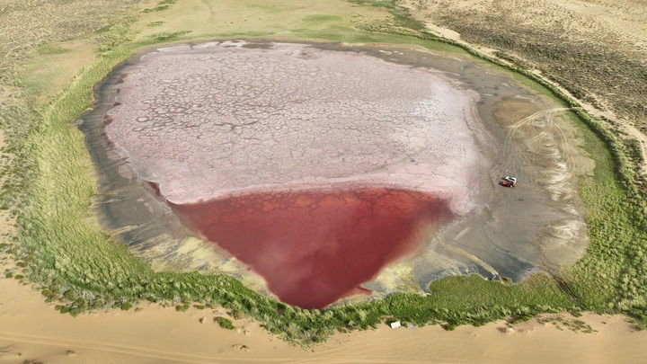 由于沙漠里很多湖泊里不是淡水,屬于鹽堿度較高水質(zhì),所以呈現(xiàn)的湖泊顏色是黃色、藍(lán)綠或粉紅(鹽堿水中紅藻所呈現(xiàn)顏色),奇幻的顏色,如同黃色沙漠中的一塊寶石。
