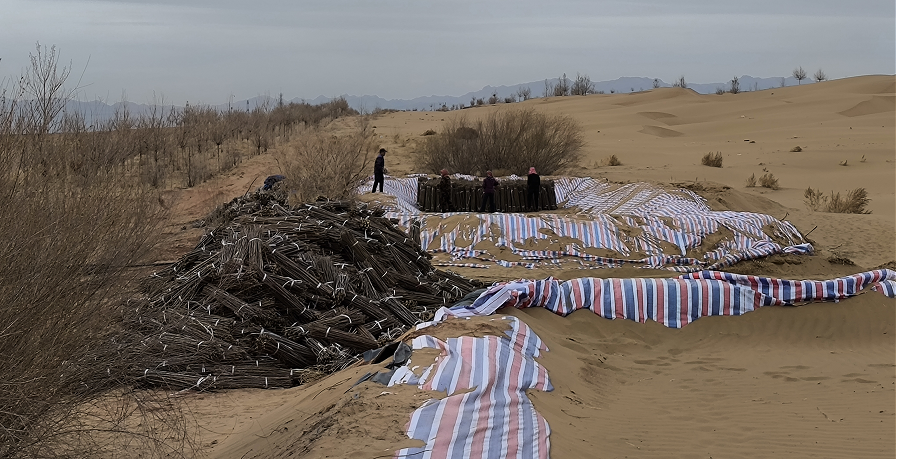 工人們正在把平茬下的沙柳運(yùn)往施工現(xiàn)場(chǎng)——鄂爾多斯市三北推進(jìn)中心供圖