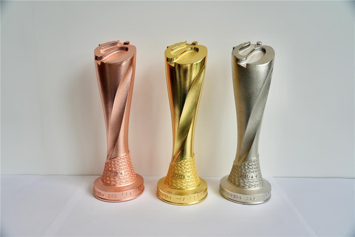 獎杯頂部為會徽“奮進(jìn)”,以傾斜45度的方式呈現(xiàn);外形采用扭轉(zhuǎn)升騰樣式設(shè)計(jì),體現(xiàn)了各民族運(yùn)動員在少數(shù)民族傳統(tǒng)體育運(yùn)動會賽場上英勇矯健的身姿和拼搏向上的精神。底部為紅山文化彩陶雙旋紋環(huán)繞四周,并鐫刻“2025·赤峰”,既展現(xiàn)中華優(yōu)秀傳統(tǒng)文化,又明確了本屆運(yùn)動會舉辦地區(qū)及時間,激勵各民族運(yùn)動員以參加本屆全區(qū)少數(shù)民族傳統(tǒng)體育運(yùn)動會為榮耀,傳承和弘揚(yáng)民族傳統(tǒng)體育文化,構(gòu)筑中華民族共有精神家園,鑄牢中華民族共同體意識。獎杯整體開模澆鑄,鋅合金制作,表面電鍍金、銀、銅顏色。(記者 肖璐)
