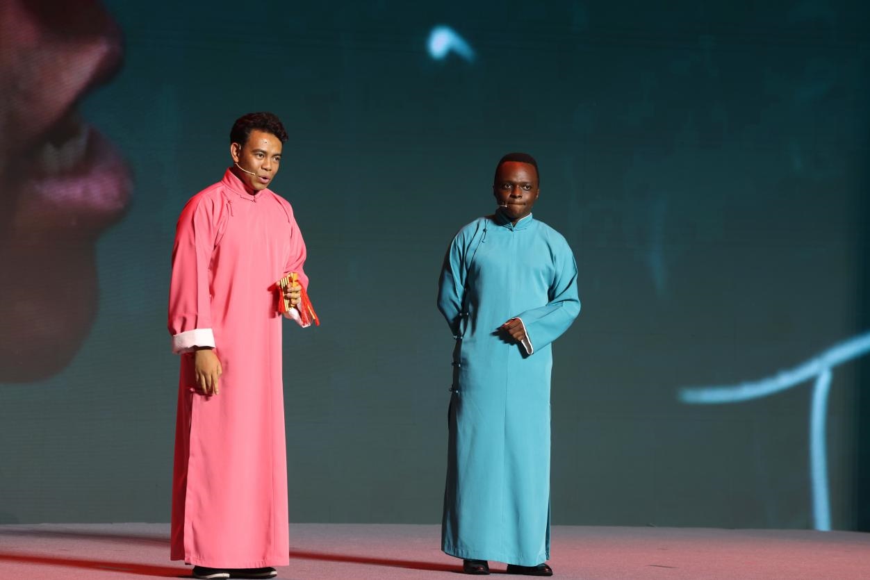 “竹板這么一打呀,咱今兒個說點(diǎn)嘛?說說一條大河煙花人間就是咱的家?!碧旖驇煼洞髮W(xué)博士生、肯尼亞小伙孔愛凱和北京外國語大學(xué)教師、馬達(dá)加斯加小伙唐磊聯(lián)袂上場,用原創(chuàng)的京東大鼓和天津快板,說唱他們眼中的中國大運(yùn)河和中國文化。