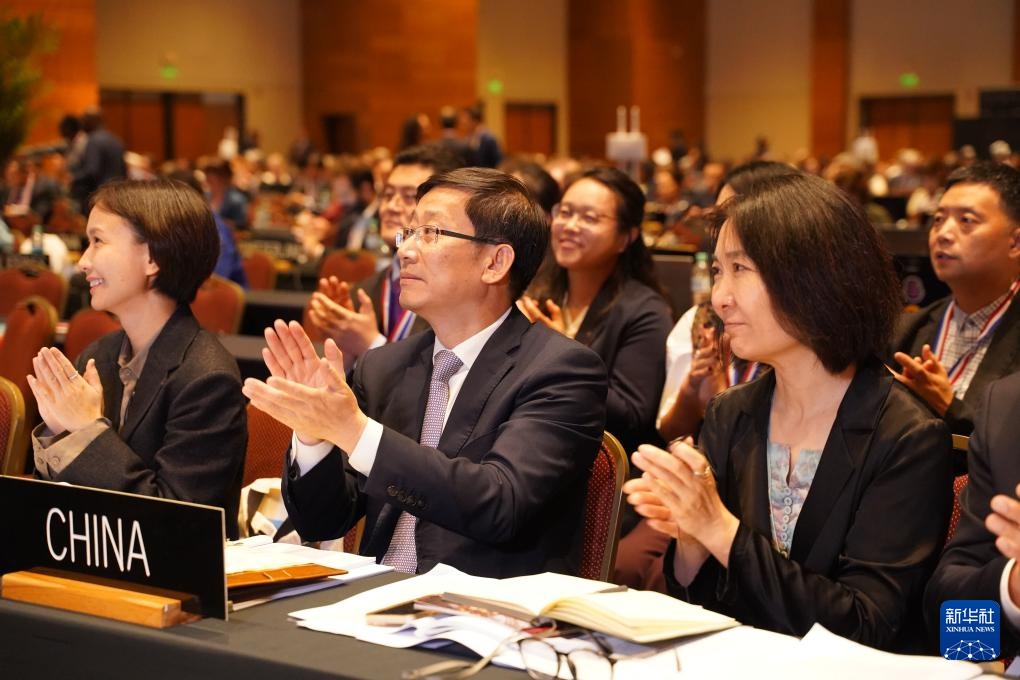 12月5日,在巴拉圭亞松森聯(lián)合國教科文組織保護(hù)非物質(zhì)文化遺產(chǎn)政府間委員會第19屆常會評審現(xiàn)場,中國代表團(tuán)慶祝。新華社記者 朱雨博 攝